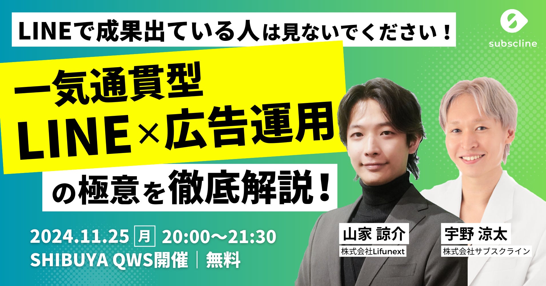 株式会社サブスクライン(本社:東京都渋谷区、代表取締役:石川勝己)は、2024年11月25日(月) 20:00に、渋谷駅直結の渋谷スクランブルスクエア15F(SHIBUYA QWS内)にて「LINEで成果出ている人は見ないでください!一気通貫型LINE×広告運用の極意を徹底解説!」と題し、参加無料の勉強会&交流会を開催します。